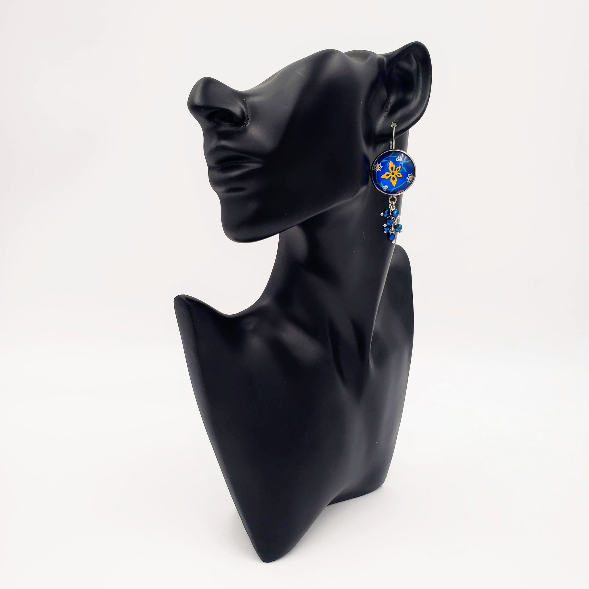 These beautiful stainless steel earrings ornated with blue iris glass beads feature a flowery design with the following specs: